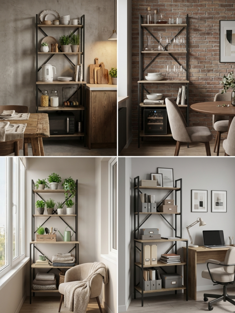Стеллаж имеет размеры 66 см в ширину и 182 см в высоту, что позволяет разместить его даже в ограниченных пространствах. Высокая конструкция дарит возможность использовать вертикальное пространство для хранения различных предметов. На широких полках удобно размещать как банные принадлежности, так и посуду, книги, а также цветы в горшках. На маленьких же полках удобно разместить, специи, контейнеры.