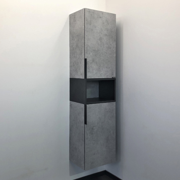 Подвесная шкаф колонна с двумя створками и пространством для открытого хранения. Створки оснащены петлями с плавным закрыванием и черными матовыми алюминиевыми ручками. Фасады из влагостойкого ЛДСП бетон светлый.