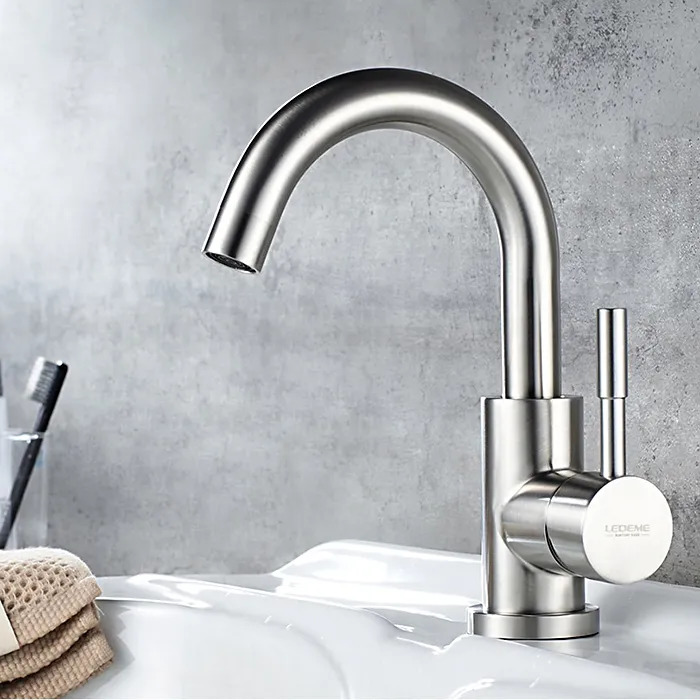 Смеситель позволяет быстро регулировать температуру и напор воды, благодаря однорычажному управлению. Популярная модель, которая обладает поворотным изливом.
