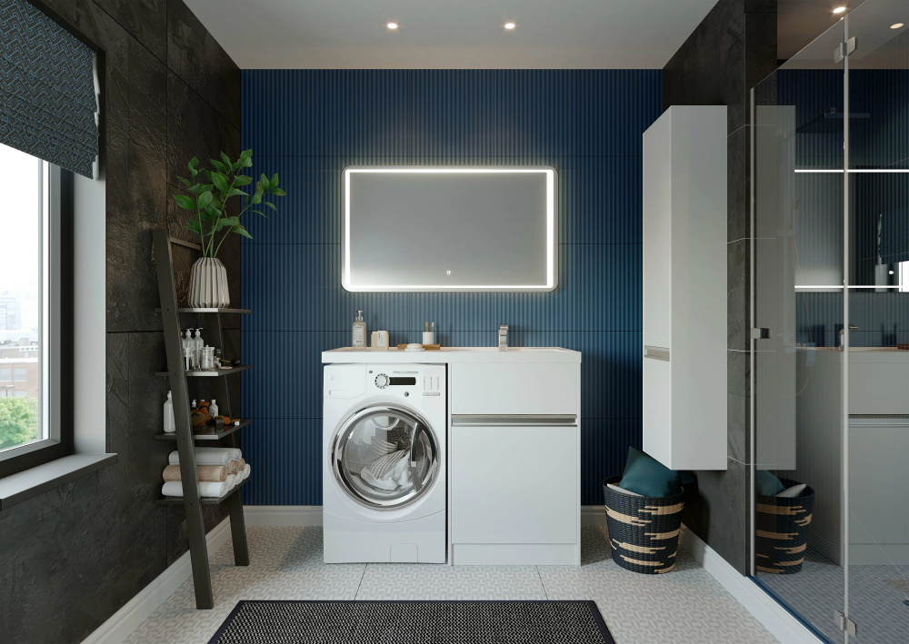 Тумба Лондри под стиральную машину выполнена из влагостойкой ламинированной плиты и окрашена в белоснежный цвет с высокой степенью глянца полиэфирной краской ультрафиолетового отверждения. Данный способ окрашивания обеспечивает изделию привлекательный внешний вид, а также износостойкость и долговечность. Верхний ящик открывается с помощью системы push-to-open, а нижний - за изящную удобную профильную хромированную ручку. Над ручкой установлена вставка из влагостойкой ламинированной плиты благородного цвета дуб наварра. Ящики выдерживают нагрузку до 25 кг. Тумба установлена на регулируемые опоры, которые находятся за цоколем.