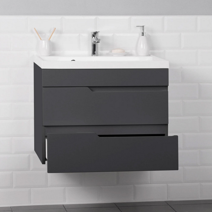 Комплект тумба Итана Sky 70 (699х448х560) подвесная, с раковиной Clarissa 70, графит (CS00091540) Подвесная тумба с раковиной из коллекции Sky -это сочетание современной стилистики и богатого функционала. Подвесной способ установки дает возможность не только визуально увеличить пространство, но и обеспечивает быстрый и удобный доступ для уборки. Тумба покрыта ПВХ-пленкой с высокой степенью глянца, что обеспечивает изделию привлекательный внешний вид, а также износостойкость и долговечность. Раковина выполнена из искусственного камня. Качественные направляющие скрытого монтажа обеспечивают плавное открывание и закрывание ящичков. Ручки интегрированы в фасад , что исключает возможность случайного удара о фурнитуру.