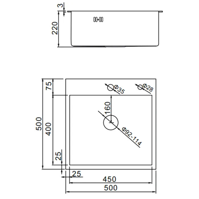 Размер мойки: ширина 50 см, глубина 50 см, высота 22 см. Размер чаши: ширина 45 см, глубина 40 см, высота 20 см. Минимальный размер отверстия в столешнице для врезной установки: ширина 46 см, глубина 46 см.