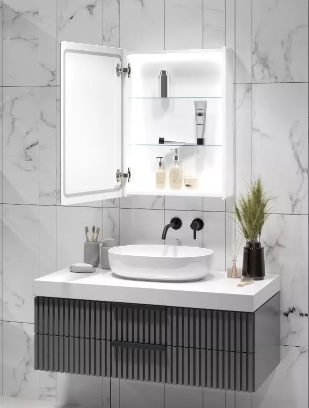 Зеркало-шкаф оснащено: светодиодной подсветкой, механическим выключателем и двумя полками для хранения.
